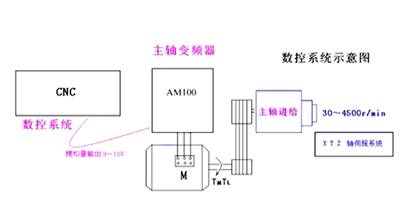 主軸電機(jī)采用AM100高性能變頻器驅(qū)動(dòng),滿足加工要求,延長(zhǎng)刀具的使用壽命。此主軸的轉(zhuǎn)速由外部模擬量信號(hào)來控制輸出頻率,在不同的加工工藝(如;粗加工、精加工等)需要不同的轉(zhuǎn)速,此時(shí)可由數(shù)控系統(tǒng)輸出不同的模擬量電壓信號(hào)給變頻器,實(shí)現(xiàn)不同的轉(zhuǎn)速,同時(shí)啟停信號(hào)也由數(shù)控系統(tǒng)控制,提高自動(dòng)化程度。